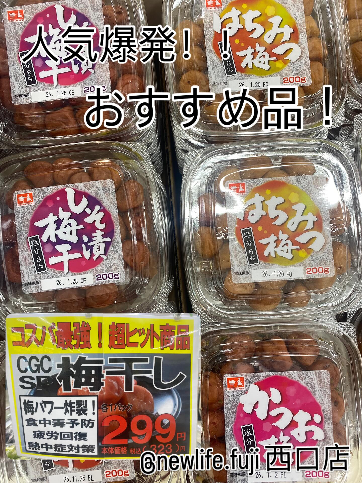 ニューライフフジ西口店です^_^まだまだ暑い日が続きます…そんな中、注目を浴びている品はコレだ!!✨✨✨✨✨✨✨✨SP 梅干し各種✨✨✨✨✨✨✨✨梅干しパワー炸裂中!ナトリウム(塩分)とクエン酸を同時..
