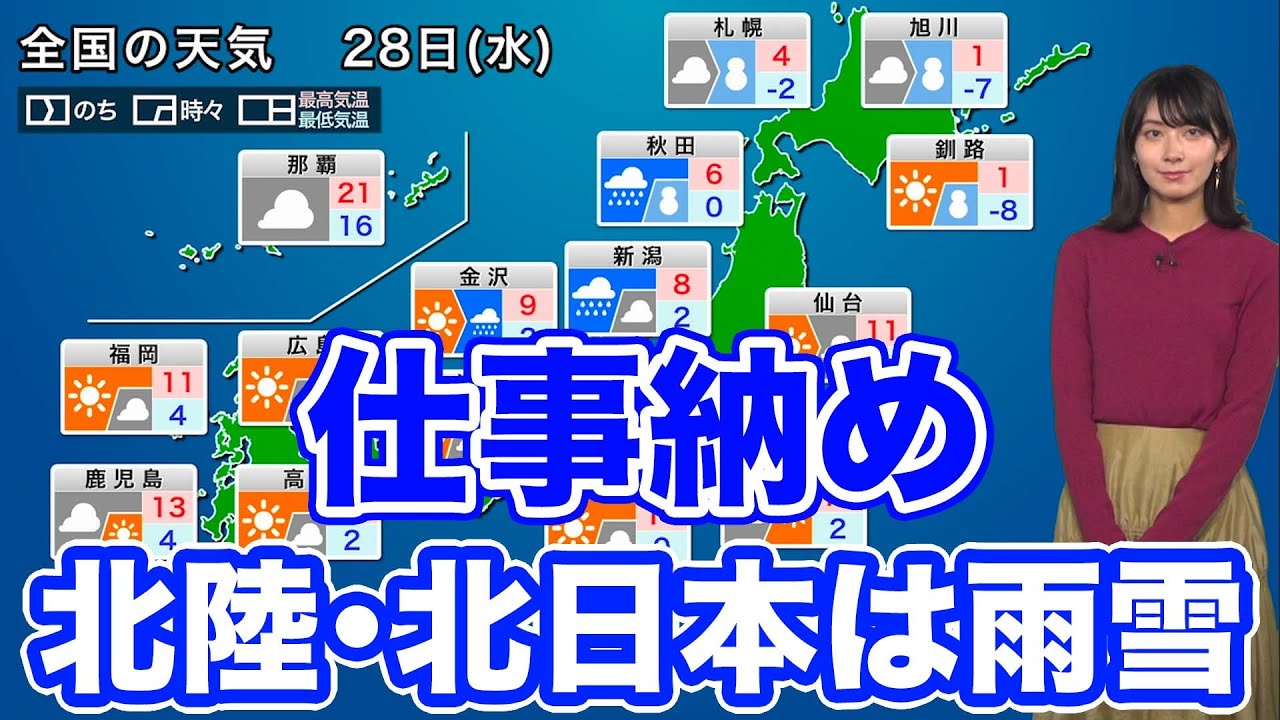 12月28日(水)の天気 仕事納めは関東以西で日差し届く 北陸、北日本は雨や雪に