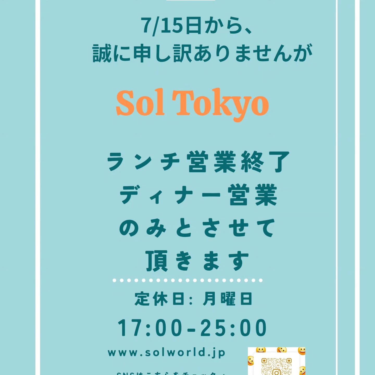 営業時間 変更のお知らせ。大変申し訳ありませんが、7.15からディナーと深夜のみ17時からの営業にさせて頂きます。是非ともまたのお越しをお待ちしております!🇲🇽🇲🇽🇲🇽🇲🇽🇲🇽SolTokyoメキシコ..