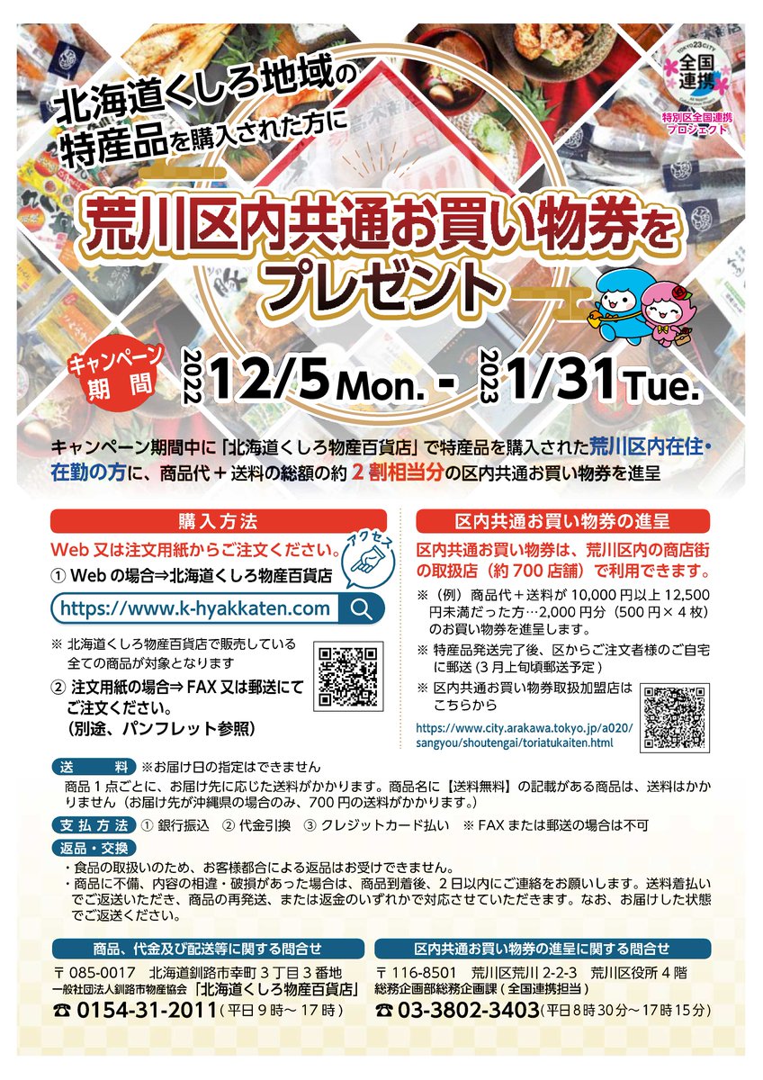 荒川区内在住・在勤の方へ朗報です!1月31日までにくしろ地域の特産品を「北海道くしろ物産百貨店」で購入された方に、商品代+送料の約2割相当の区内共通お買い物券を進呈します!⇒www.city.arak..