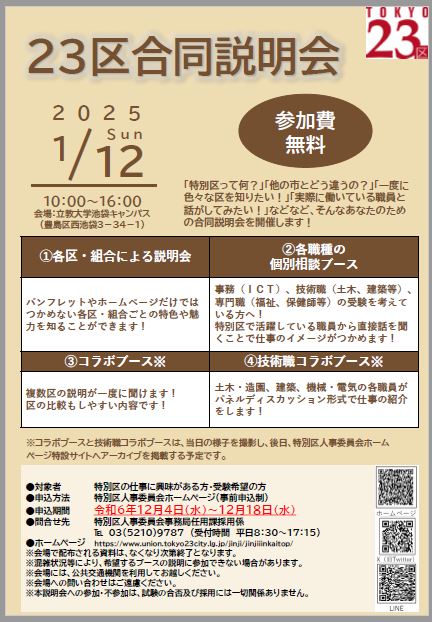 【イベント】1/12(日)に、立教大学で「23区合同説明会」を開催します。文京区ブースでは、若手職員が文京区で働く魅力をお伝えします。この機会をぜひ活用してください!(注)本説明会の実施に関して、会場..