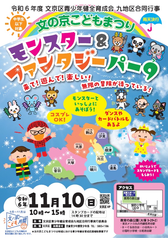 【イベント】11/10(日)10時~15時、教育の森公園で青少年健全育成会九地区合同行事「文の京こどもまつり」を開催します。今年のテーマは、「モンスター&ファンタジーパーク」フォトスポットやカードバト..