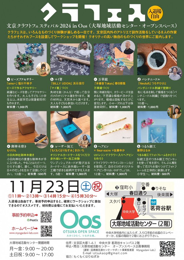 【イベント】11/23(祝・土)11時から、大塚地域活動センターオープンスペースで「文京クラフトフェスティバル2024」を開催します。文京区で創作活動をしている8人の作家たちがそれぞれブースを設置して..