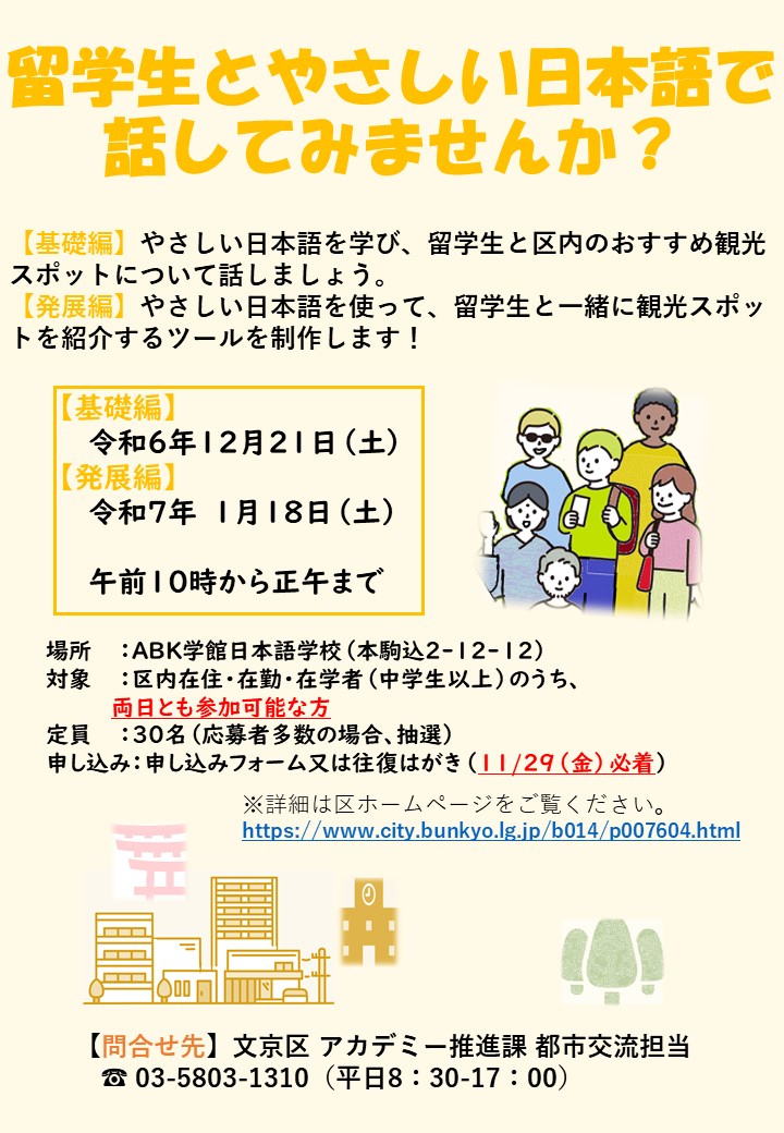 【イベント】12/21(土)と1/18(土)10時~12時、「やさしい日本語で留学生と区内おすすめスポットを紹介しよう!(全2回)」を開催します。やさしい日本語を学び、留学生と一緒に区内おすすめスポッ..