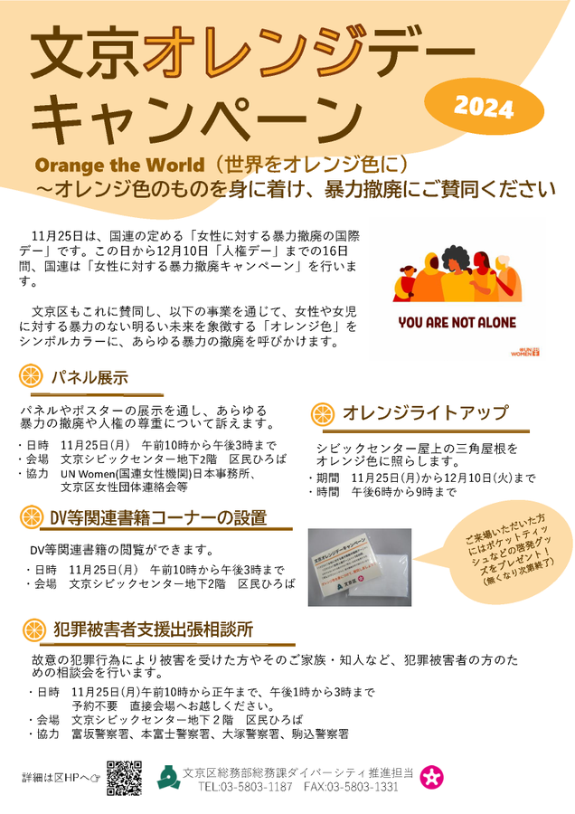 UNWomen(国連女性機関)では、11月25日の「女性に対する暴力撤廃の国際デー」から12月10日の「人権デー」までの16日間、女性や女児に対する暴力撤廃を世界中で呼び掛けています。文京区では、UN..