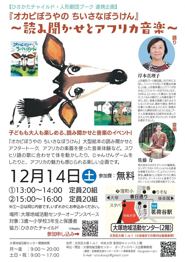 【イベント】12/14(土)@大塚地域活動センターオープンスペースにて、区内の出版社「ひさかたチャイルド」と連携した読み聞かせイベントを実施します。大型絵本の読み聞かせ、オカピの人形を使ったお話、アフ..