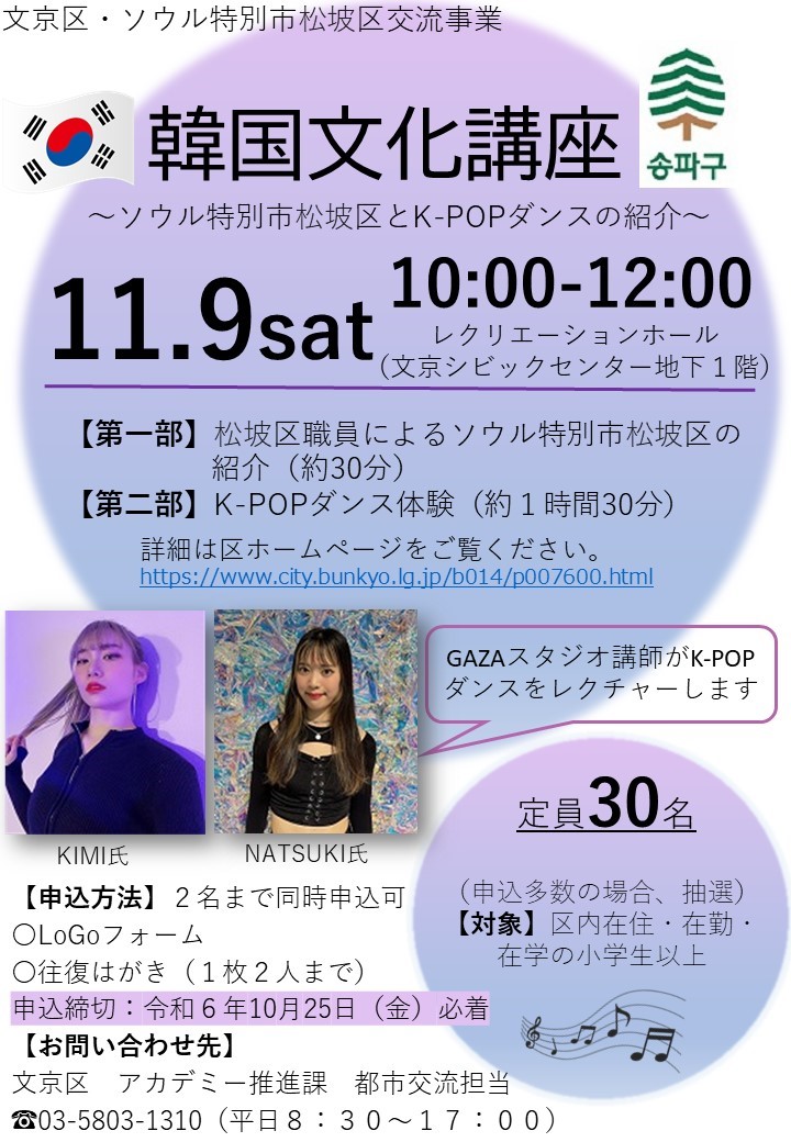 【お知らせ】11/9(土)10時~12時、韓国文化講座を開講します。区の交流都市であるソウル特別市松坡区の紹介とK-POPダンスを体験できます。申込フォーム又は往復はがきで、10/25(金)までにご応..