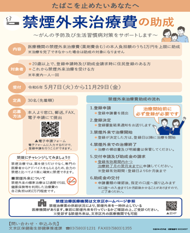 【お知らせ】<禁煙外来治療費の一部を助成します>喫煙は、がんや脳卒中等の病気の原因になります。また、受動喫煙は周囲の人の健康に影響します。ご自身や家族の健康を守るため、禁煙してみませんか?※治療開始前..