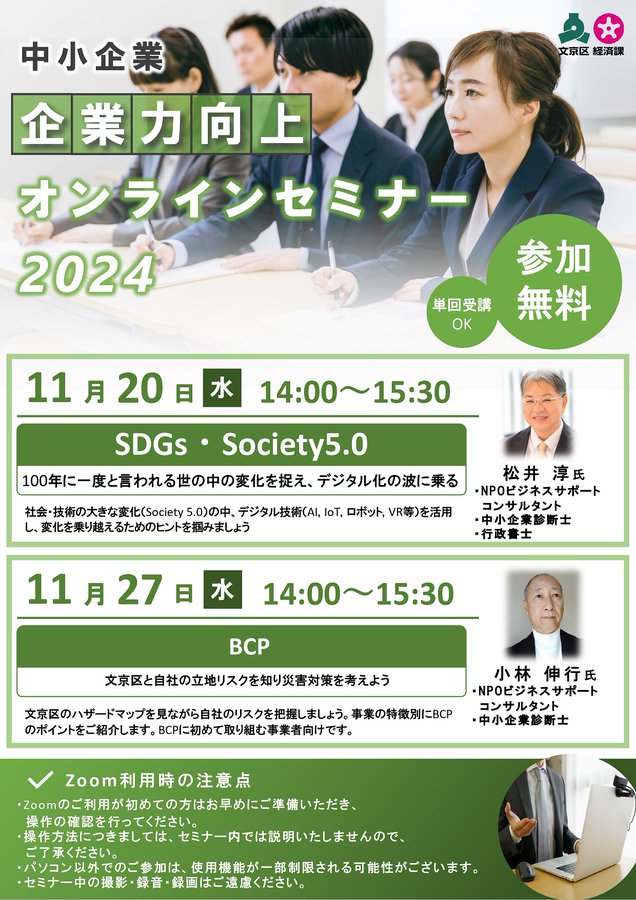 【募集】11/20・27、12/4・11(水)14時~15時30分、中小企業向け「企業力向上オンラインセミナー」を開催します。SDGs、BCP、働き方改革等をテーマに、企業力の向上に役立つ情報をお伝え..