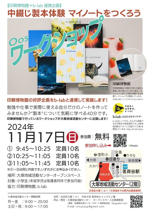 【イベント】11/17(日)@大塚地域活動センターオープンスペースにて、印刷博物館とb-lab連携企画「中綴じ製本体験マイノートをつくろう」を実施します。製本について気軽に学べる小学生向けワークショッ..