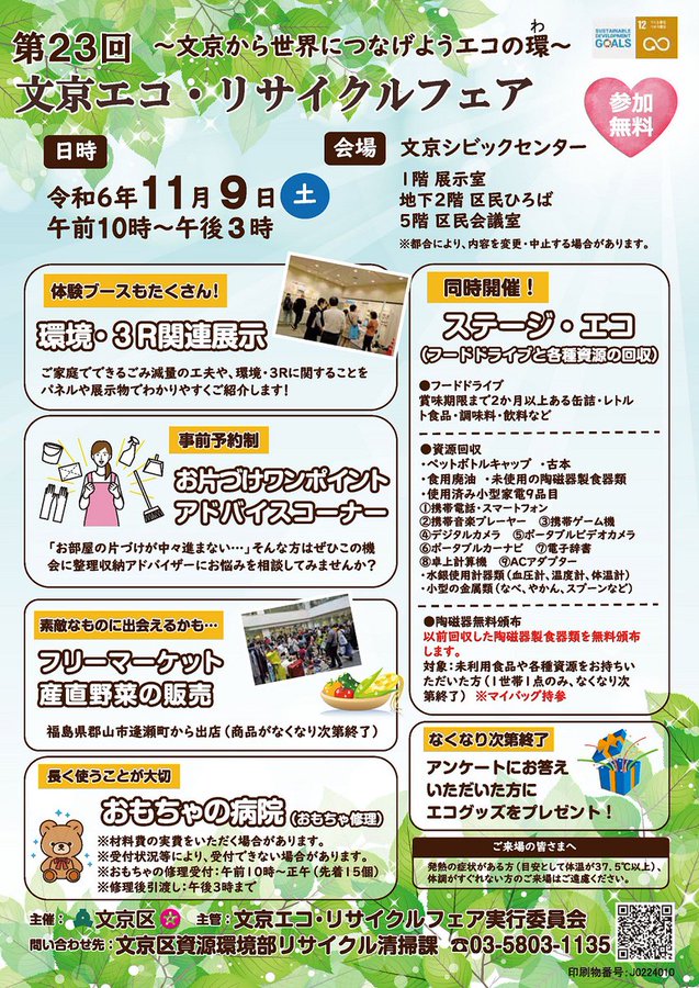 【イベント】11/9(土)文京エコ・リサイクルフェア開催。パネル展示、資源回収、お片づけワンポイントアドバイス(要予約)、おもちゃの病院、フリーマーケット、産直野菜販売を行います。アンケートにお答えい..