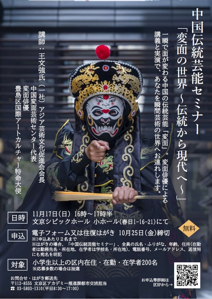 【イベント】11月17日(日)16時~17時30分、シビックホール小ホールにて、「変面」をテーマに「中国伝統芸能セミナー」を開催します!参加申込は申込フォームまたは往復はがきで、10月25日(金)必着..