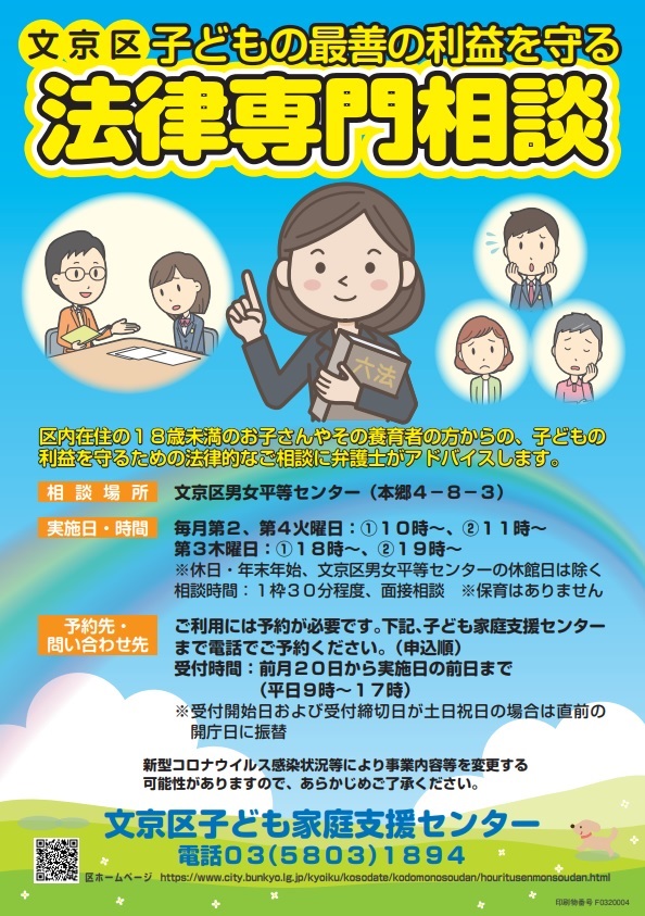 【募集】10/18(金)9時から、11月分「子どもの最善の利益を守る法律専門相談」の予約を開始します(申込順)。予約・お問合せは区ホームページをご覧の上、子ども家庭支援センター家庭支援係(03-580..