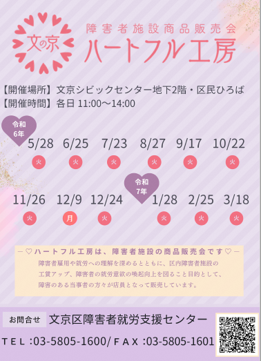 【イベント】10/22(火)の11~14時、シビックセンター地下2階区民ひろばで「文の京ハートフル工房障害者施設商品販売会」を開催します。食品(パン等)・雑貨(袋小物等)販売や名刺等印刷の注文受付をし..