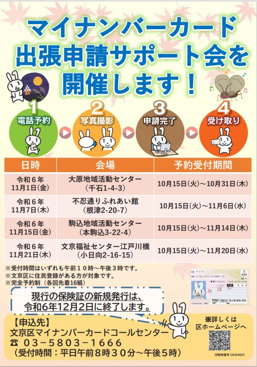 【募集】11/1(金)に大原地域活動センター、11/7(木)に不忍通りふれあい館でマイナンバーカード出張申請サポート会を実施します。(各回先着16組)区職員が顔写真を撮影し、申請を手伝います。予約は1..