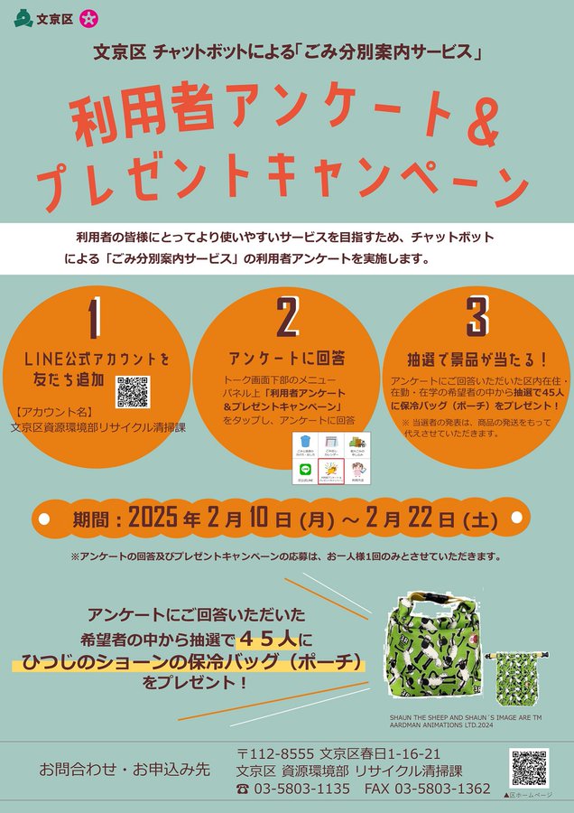 【お知らせ】「ごみ分別案内サービス」利用者アンケート&プレゼントキャンペーン実施中!アンケートに回答いただいた区内在住・在勤・在学の希望者の中から、抽選で45人の方にひつじのショーンの保冷バッグ(ポー..