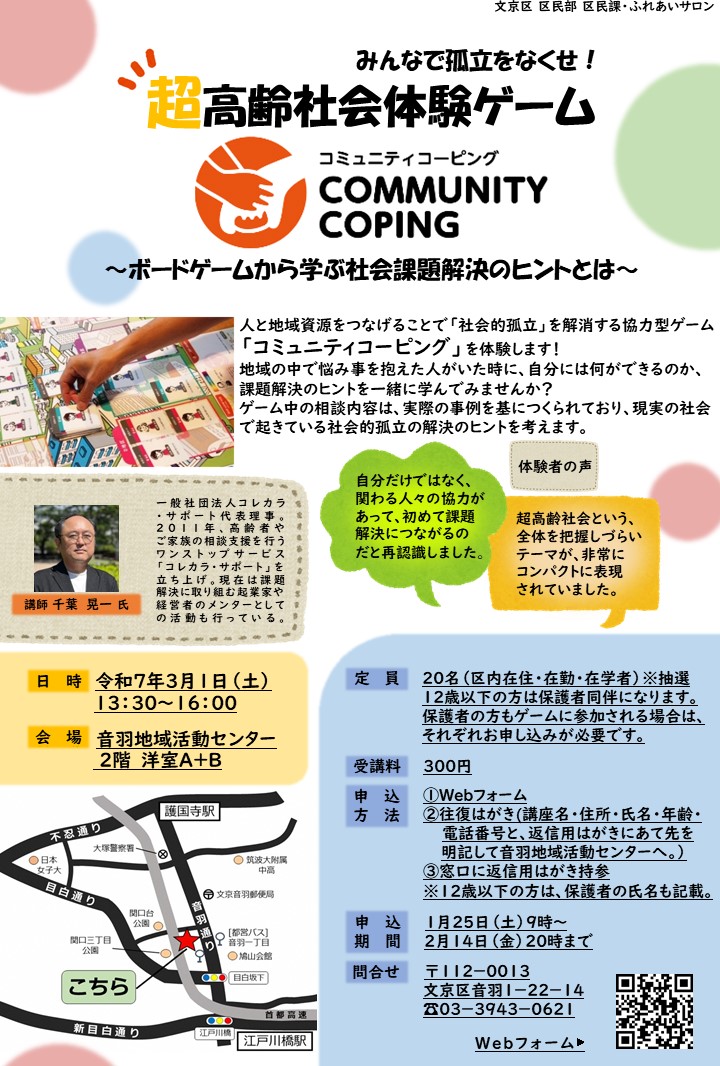 【募集】3/1(土)13時30分~16時ふれあいサロン音羽「超高齢社会体験ゲームコミュニティコーピング」を開催します。人と地域資源をつなぐことで「社会的孤立」を解消する協力型ゲームを通して、社会課題解..