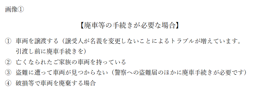 【お願い】~バイク・軽自動車の廃車手続きを~軽自動車税(種別割)は4/1現在、バイクや軽自動車を持つ方が納める税金です。以下の場合(画像①)は<3/28(金)>までに車両が廃車されれば、7年度から税金..