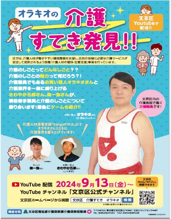 【イベント】介護職員でもあるお笑い芸人オラキオさんや、介護業界を一緒に盛り上げるさわやか五郎さん、森一弥さんと、区内介護事業所の若手介護職員とのトークセッションをYouTubeで配信中!「介護」につい..