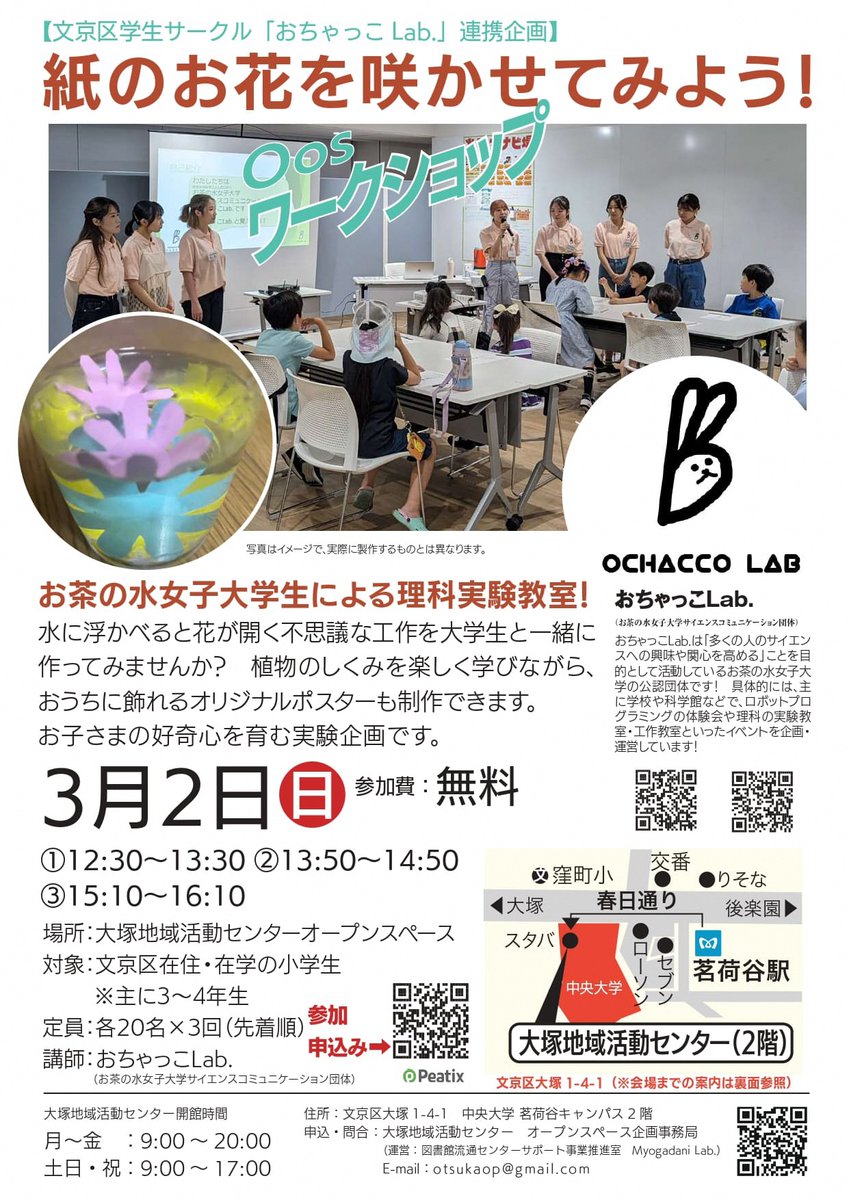 【イベント】3/2(日)@大塚地域活動センターオープンスペースにて「<おちゃっこLab.連携企画>紙のお花を咲かせてみよう!」を実施します。紙を花の形に切り取り、水に浮かばせる開く工作を大学生の皆さん..