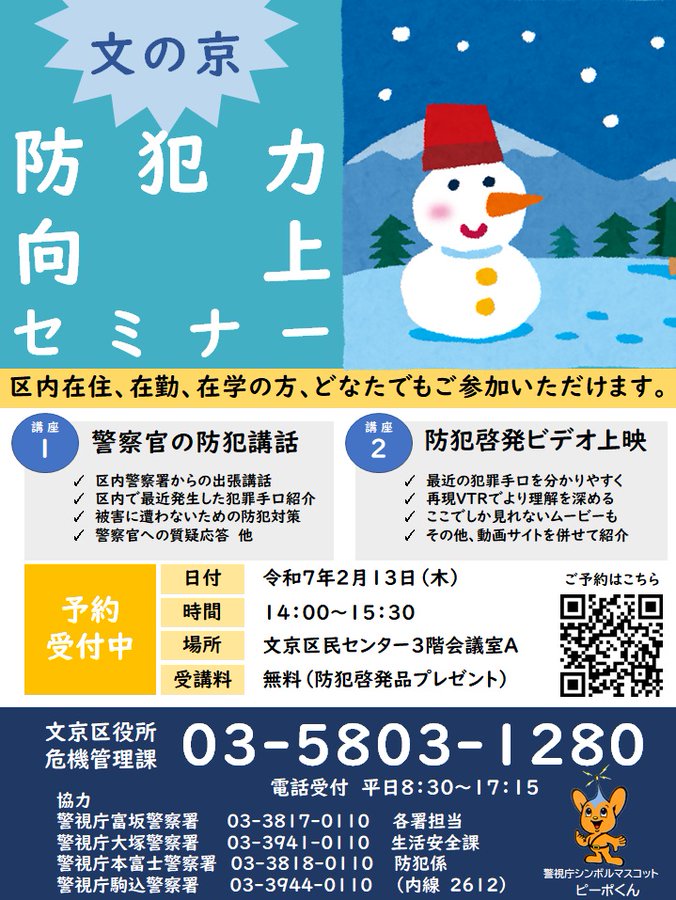 【イベント】2/13(木)14時~15時30分区民センター3階会議室Aにおいて、「文京防犯力向上セミナー」と題した警察官による防犯講習会を開催します。詳細は、区ホームページをご覧ください。https:..