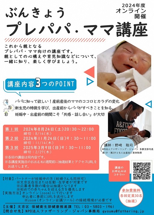 【募集】「ぶんきょうプレパパ・ママ講座」をオンライン(Zoom)開催します。[第3回]3/9(日)9時30分~11時参加費無料。第3回の申し込みは2/27(木)まで受付中。詳細は区HPをご覧ください。..
