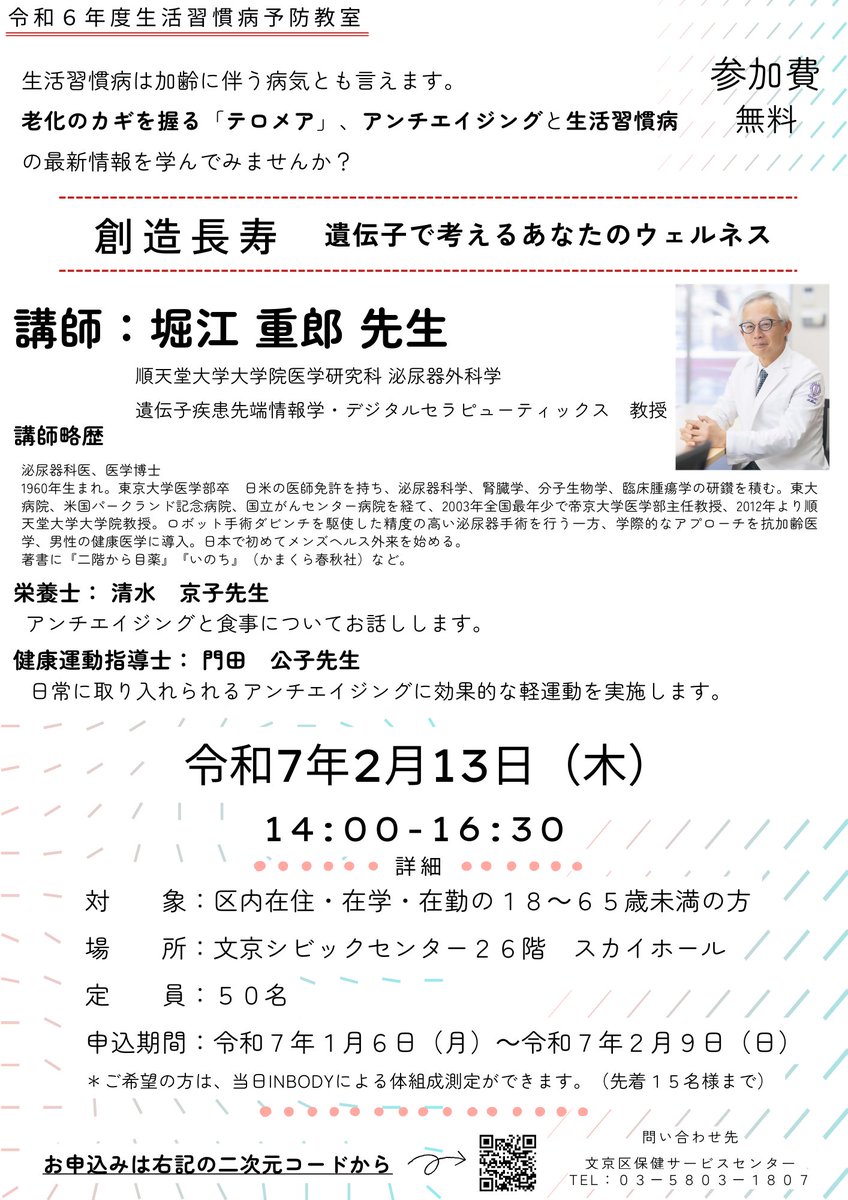 【イベント】生活習慣病は加齢に伴う病気とも言えます。老化のカギを握る「テロメア」、アンチエイジングと生活習慣病の最新情報を学んでみませんか?医師・栄養士の講義、健康運動指導士の軽運動指導。会場にて、I..
