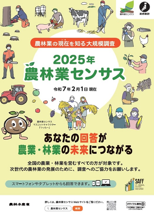 【お知らせ】農林水産省は、2/1(土)を調査期日として、「2025年農林業センサス」を実施します。この調査は農林業を営む全ての世帯や会社等を対象に行われ、農林業施策などの基礎資料として利用されます。ご..