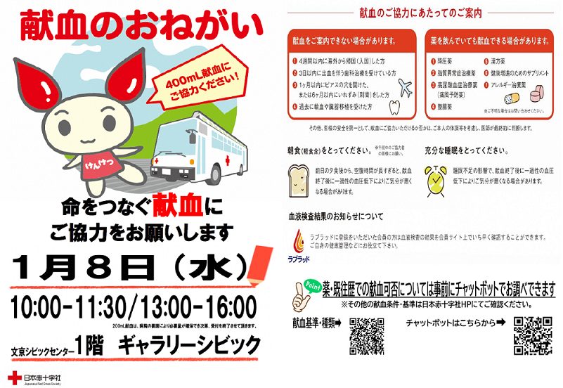 【イベント】明日1/8(水)10時~11時30分、13時~16時までシビックセンター1階ギャラリーシビックにおいて献血を実施します。安全な血液製剤を安定的に確保するために、皆様のご協力をお願いいたしま..