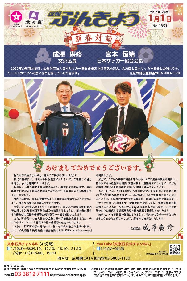 【お知らせ】新年あけましておめでとうございます。区報ぶんきょう1月1日号を新聞折込で配付しました。対談では、公益財団法人日本サッカー協会の宮本恒靖会長を迎え、#文京区と日本サッカー協会との関わりや、ワ..