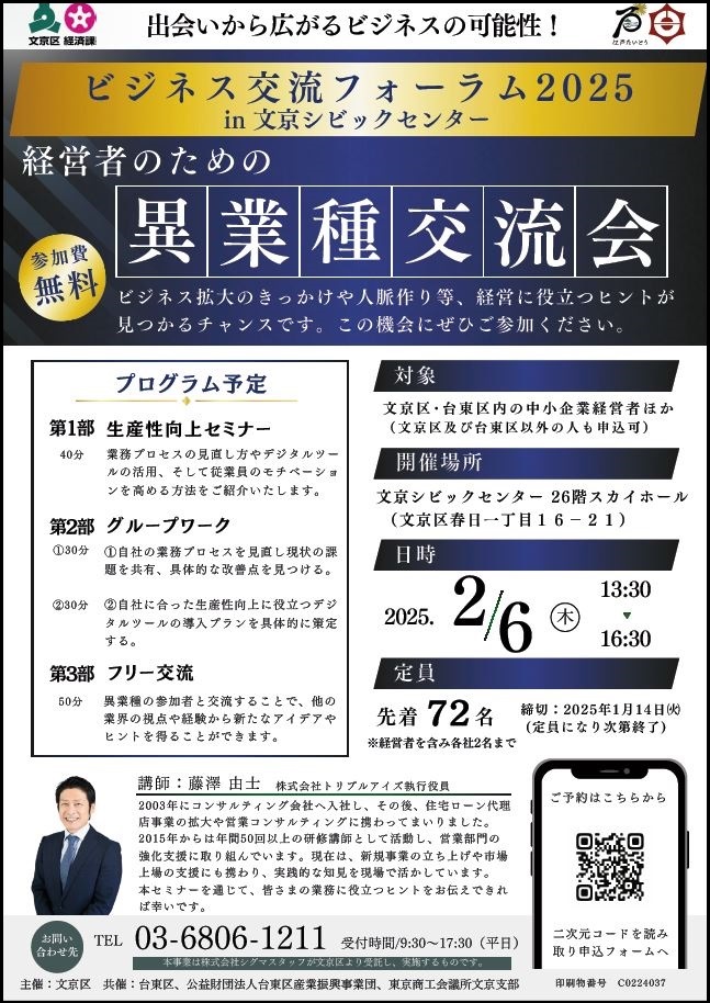 【イベント】中小企業者の方のビジネスの情報交換や人脈づくりの場として、<ビジネス交流フォーラム2025>を開催します。区内外の企業の方とのネットワークが作れる絶好の機会です。是非ご参加ください。htt..