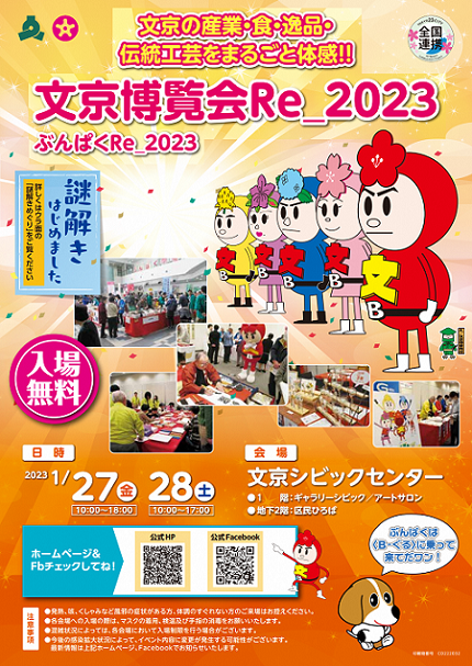 【イベント】1/27(金)10時~18時、1/28(土)10時~17時の2日間、文京シビックセンター1階、地下2階で「文京博覧会Re_2023」を開催します。区内商店、連携自治体による物販、伝統工芸の..