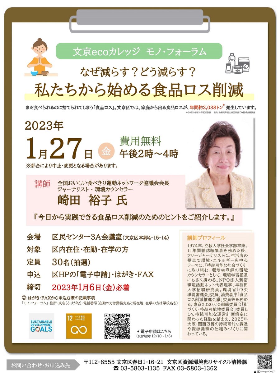 【募集】1/27(金)14時から区民センターで文京ecoカレッジモノ・フォーラム「なぜ減らす?どう減らす?私たちから始める食品ロス削減」を開催します。参加希望の方は1/6(金)までに電子申請・はがき又..