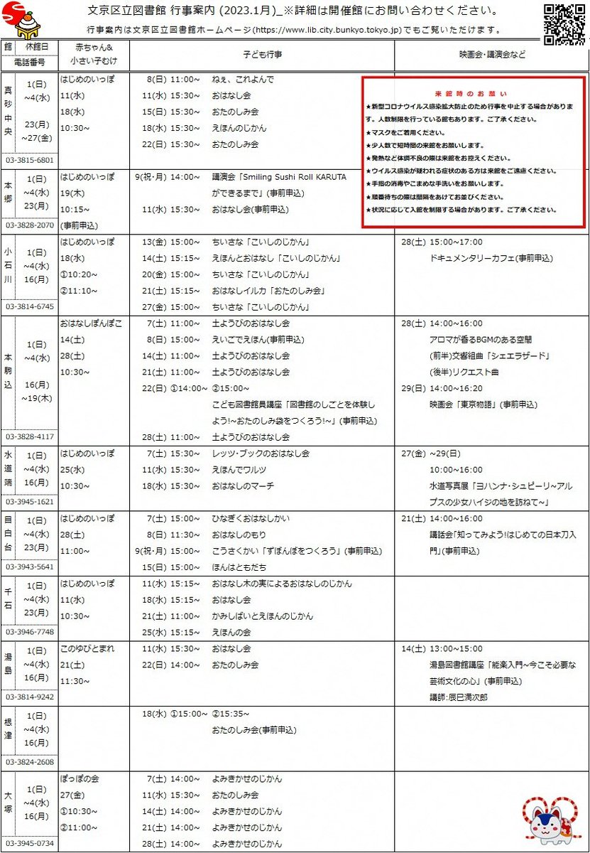【お知らせ】文京区立図書館から1月の行事予定をお知らせします。皆さんぜひご参加ください。事前に申込みが必要な場合もありますので、開催館にお問い合わせください。なお、ご来館の際はマスク着用など感染予防対..