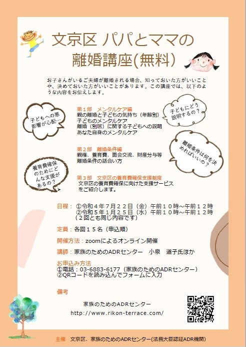【募集】5年1/25(水)10時から開催の「パパとママの離婚講座」について受講者を募集します。Zoomによるオンライン開催で、子どものメンタルケアや離婚条件の話し合い方などについてお伝えしています。詳細は区HPをご確認ください。