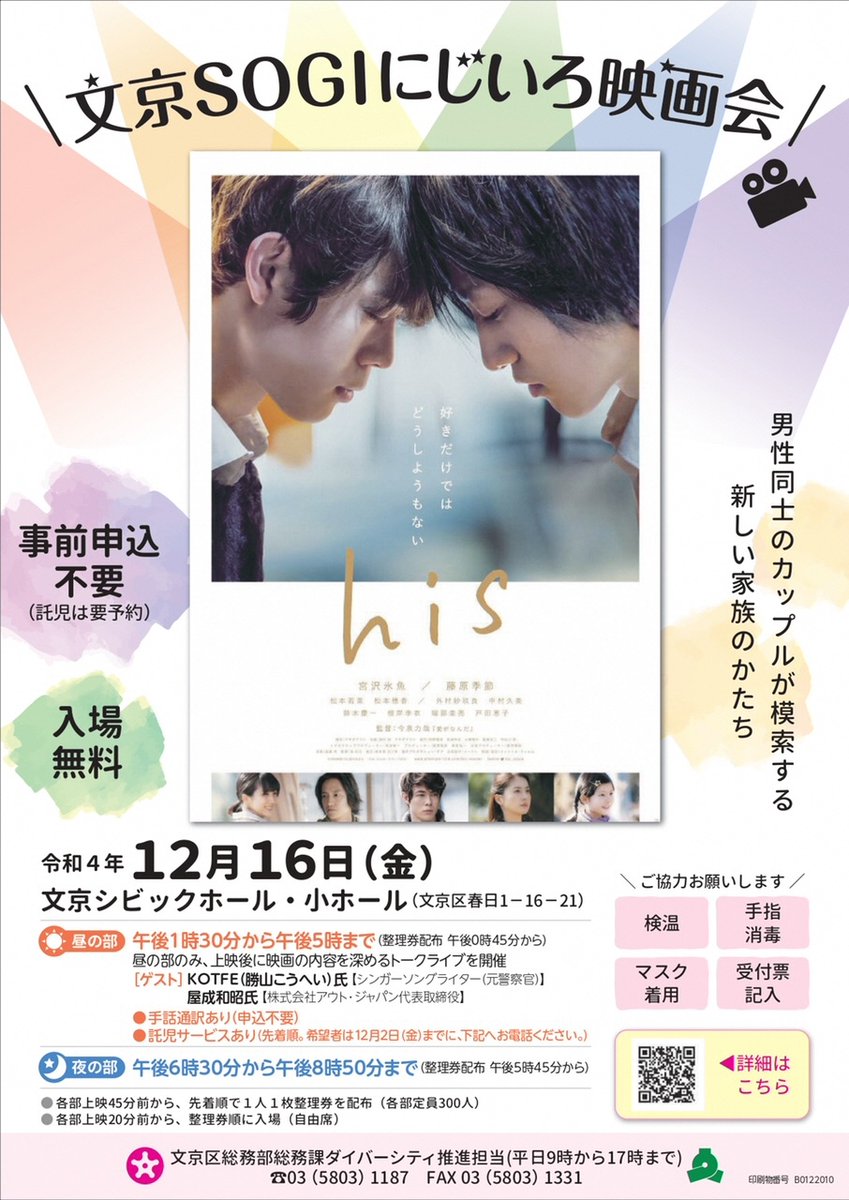 【イベント】本日12/16(金)に、シビックホール小ホールで、映画「his」を上映します!昼(13時30分~)と夜(18時30分~)の2回上映です。昼の部では上映後、映画の内容を深めるトークライブを開催します。入場無料、詳細は区HPへ。