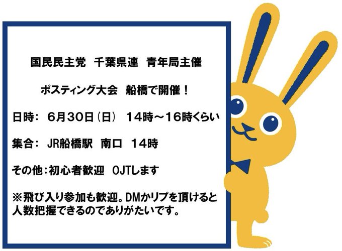 千葉県連内で声をかけておりましが、お手隙でしたらぜひお越しください。県連青年局でポスティング大会開催です!#国民民主党