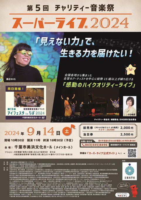 /第5回チャリティー音楽祭スーパーライブ2024開催!\全国各地から集まった全盲のアーティストを中心に、総勢20組が繰り広げる「感動のハイクオリティーライブ」ですたくさんのご来場お待ちしています9/1..