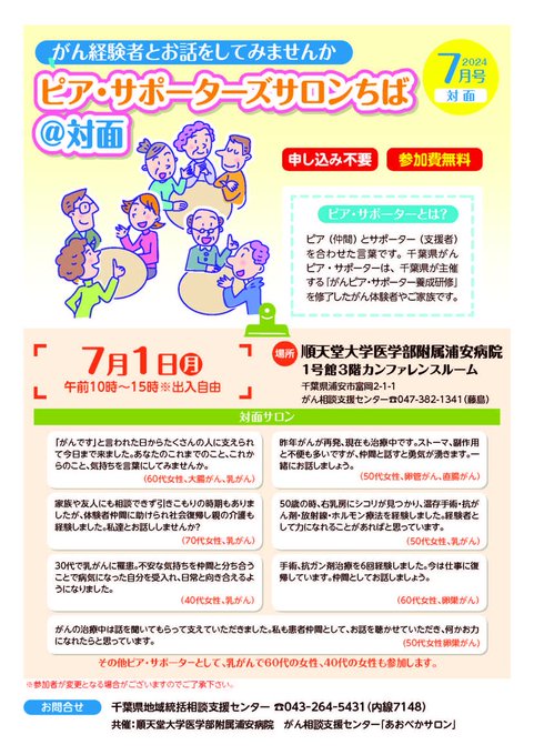 【がん体験者とお話をしてみませんか~ピア・サポーターズサロンちば】千葉県がんピア・サポーターがお待ちしています7月1日と30日に対面サロンがあります。開催病院等の詳細はURLから。〈7/1詳細〉htt..