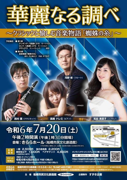 .。:+*゚゜゚*+:。華麗なる調べクラシックと愉しむ音楽物語「蜘蛛の糸」.。.。:+*゚゜゚*+開催日:7月20日(土)クラシック曲や芥川龍之介の短編「蜘蛛の糸」をもとにした声楽曲をお届けします!ご..