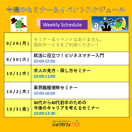 ジョブカフェちば来週の予定30代から40代前半のための今後のキャリアを考えるセミナーを開催!働く目的を整理し30~40代に企業が求めること・就活市場を知って今後のキャリアデザインや就職活動に役立てるセ..