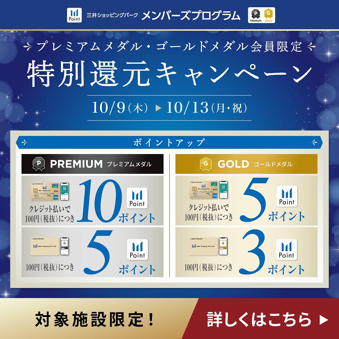 ・✨三井ショッピングパークメンバーズプログラム✨\\プレミアムメダル・ゴールドメダル会員限定//特別還元キャンペーン開催! 10/9(木)~10/13(月・祝)の期間、三井ショッピングパーク各施設等..
