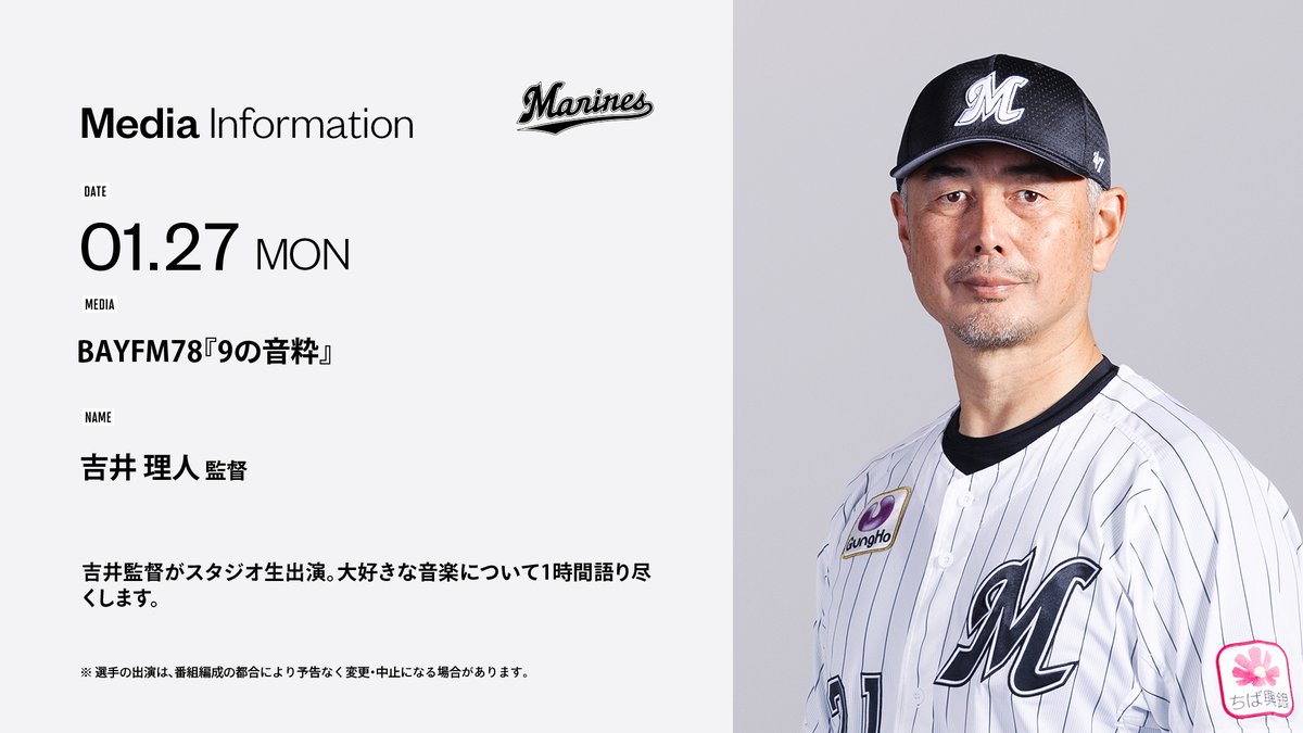 / 明日のメディア情報! \ ■1/27(月)21:00~ BAYFM78『9の音粋』 #吉井理人 監督がスタジオ生出演。大好きな音楽について1時間語り尽くします。 ▼https://marines.co.jp/news/detail/202500591055.html… #chibalotte