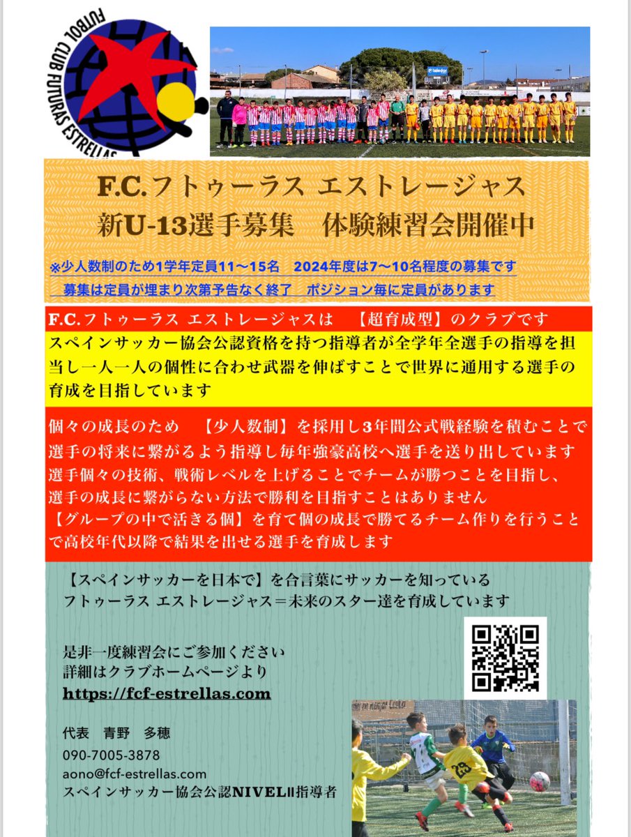 練習会開始F.C.フトゥーラスエストレージャスでは2025年度新U-13選手の練習会を始めます毎年1学年11人のみの採用のため、ご興味のある方は是非お早めにご参加ください