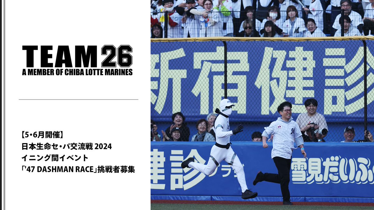 日本生命セ・パ交流戦でも、正体不明の俊足スプリンター「DASHMAN」とファン代表のチャレンジャーによるダッシュ対決「'47DASHMANRACE」を開催!現在、5月・6月のチャンレンジャーを募集中で..