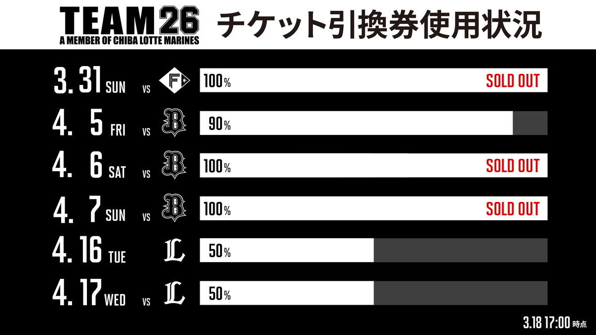 公式戦ではTEAM26有料会員特典のチケット引換券をご利用できます。 1試合毎に使用できる引換券の上限枚数を設けており、残りわずかの試合もありますので、お早めにご使用ください! ▼ #chibalotte
