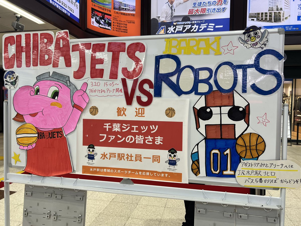 広報チーム、水戸駅に到着🚃改札を出たところに #水戸駅 の社員の皆さまからこんな素敵なお出迎えが🥺✨本日はよろしくお願いいたします🐘🤖🏀現地組の皆さまもお気をつけてお越しください💫 #千葉ジェッツ #茨城ロボッツ #Bリーグ
