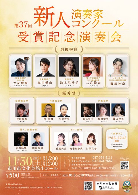 【チケット販売情報】11/30(土)「第37回新人演奏家コンクール受賞記念演奏会」のWEB販売は終了しておりますが、お電話(047-379-5111)では公演当日までご予約が可能です。ぜひお早目にお買..