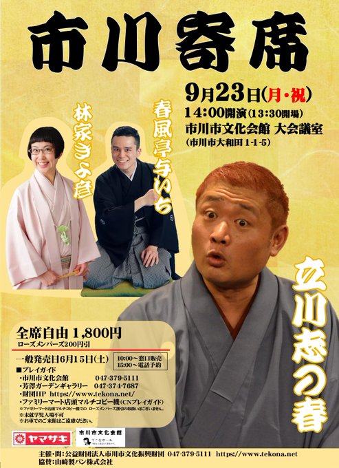 【明日発売】市川寄席〈公演日〉2025年2月16日(日)/開演14:00〈会場〉市川市文化会館大会議室明日10:00よりチケット発売です!(10:00~店頭、15:00~電話)詳細はこちらhttps:..