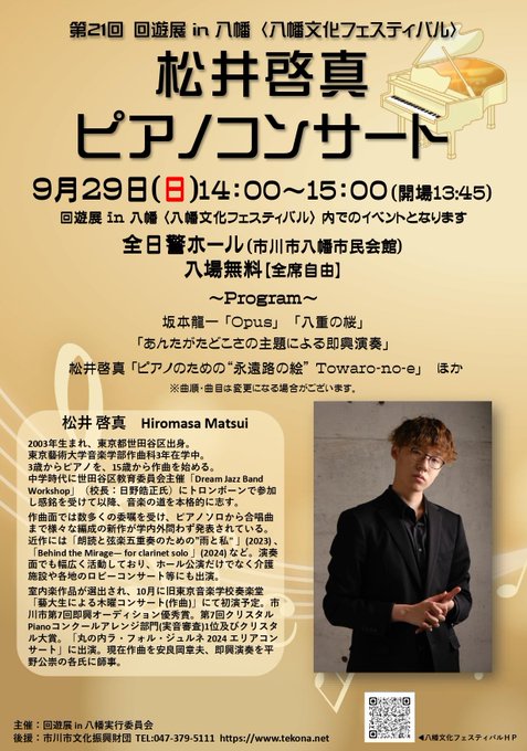 【明日開催!】*入場無料*松井啓真ピアノコンサート※第21回回遊展in八幡<八幡文化フェスティバル>内でのイベントとなります。日時:9月29日(日)開演14:00終演15:00会場:全日警..